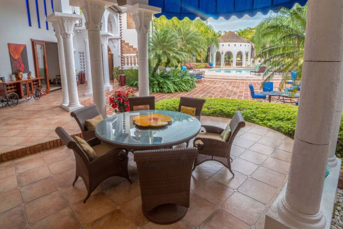 The formal indoor dining room is perfect for elegant dinners, while outdoor dining options include the covered terrace or poolside under the stars.