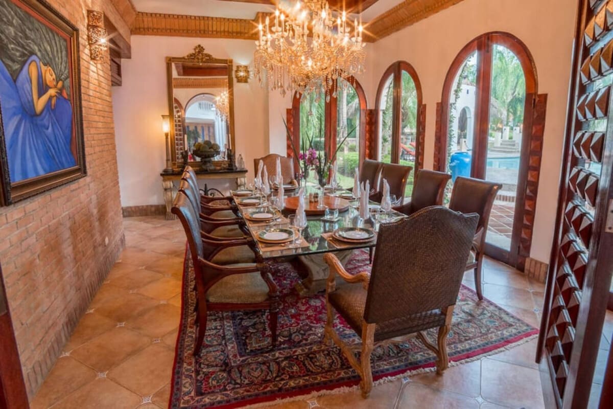 The formal indoor dining room is perfect for elegant dinners, while outdoor dining options include the covered terrace or poolside under the stars.
